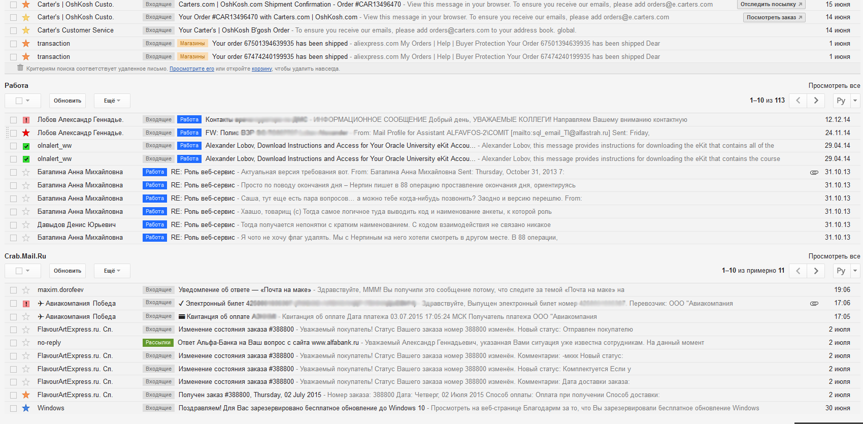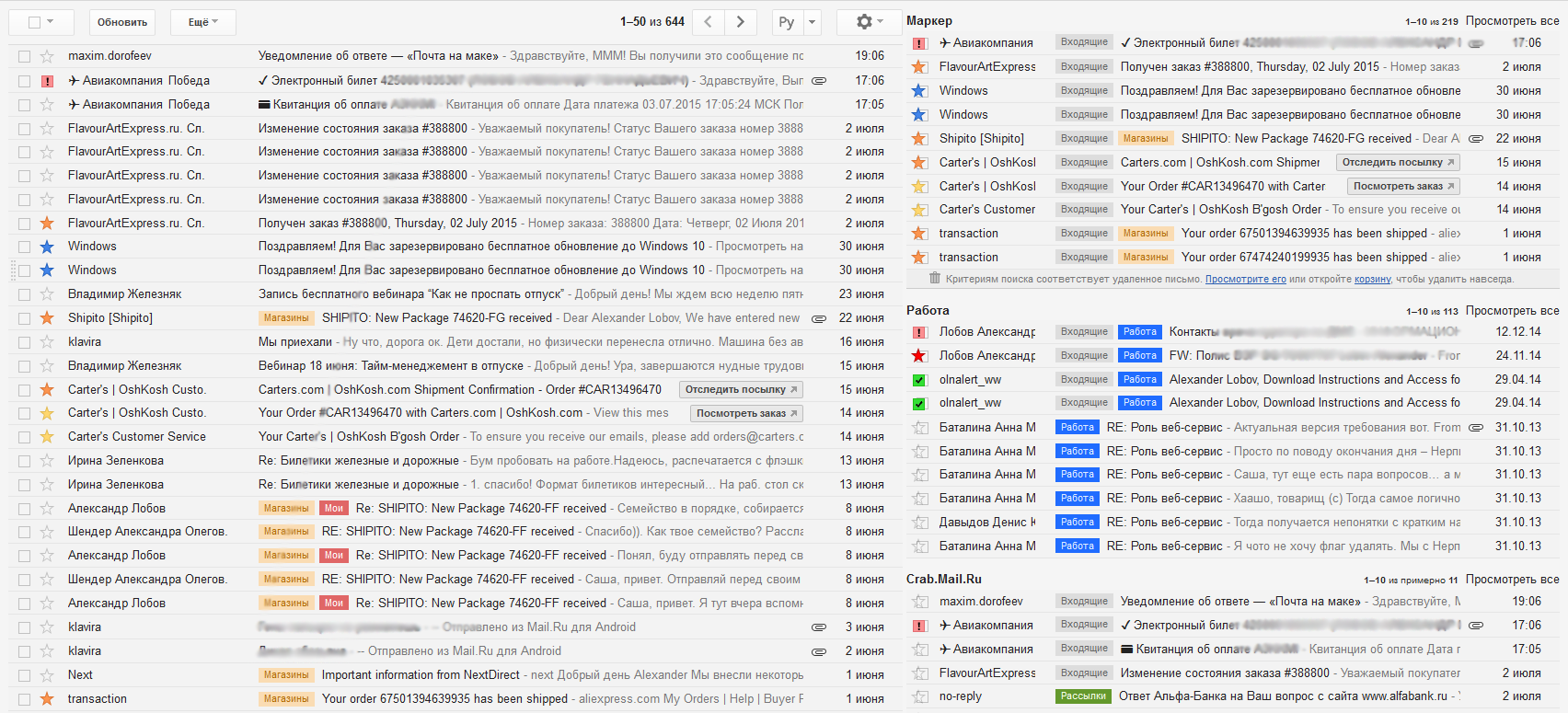 Плюс пояснения: это пример вообще ни разу не разобранного инбокса - здесь видно, что одно и то же письмо может соотвествовать разным фильтрам/настройкам и попадать одновременно в несколько папок. Соответственно, если входящие чистить (сливать в архив), то они будут видны только в настраиваемых папках.