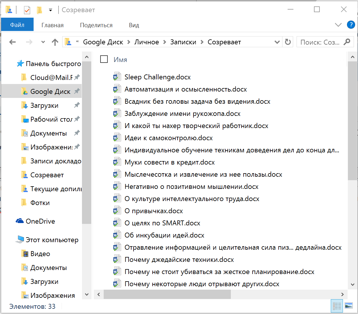 Вот иду такой, никого не трогаю, и тут фигак и в голове мысль проскочила. Если я ее классифицировал как потенциальную тему для блога, то тут же записываю в склад-инкубатор. Физически склад-инкубатор - это папка на гуглодиске с вордовыми файлами: Название файла - будущая тема, а в самом файле все, что за 1-2 минуты вылезло из мозга по этой теме. Бессистемно. Просто чтобы сохранить. Например, так: или так: Фаза 2: Инкубирование
