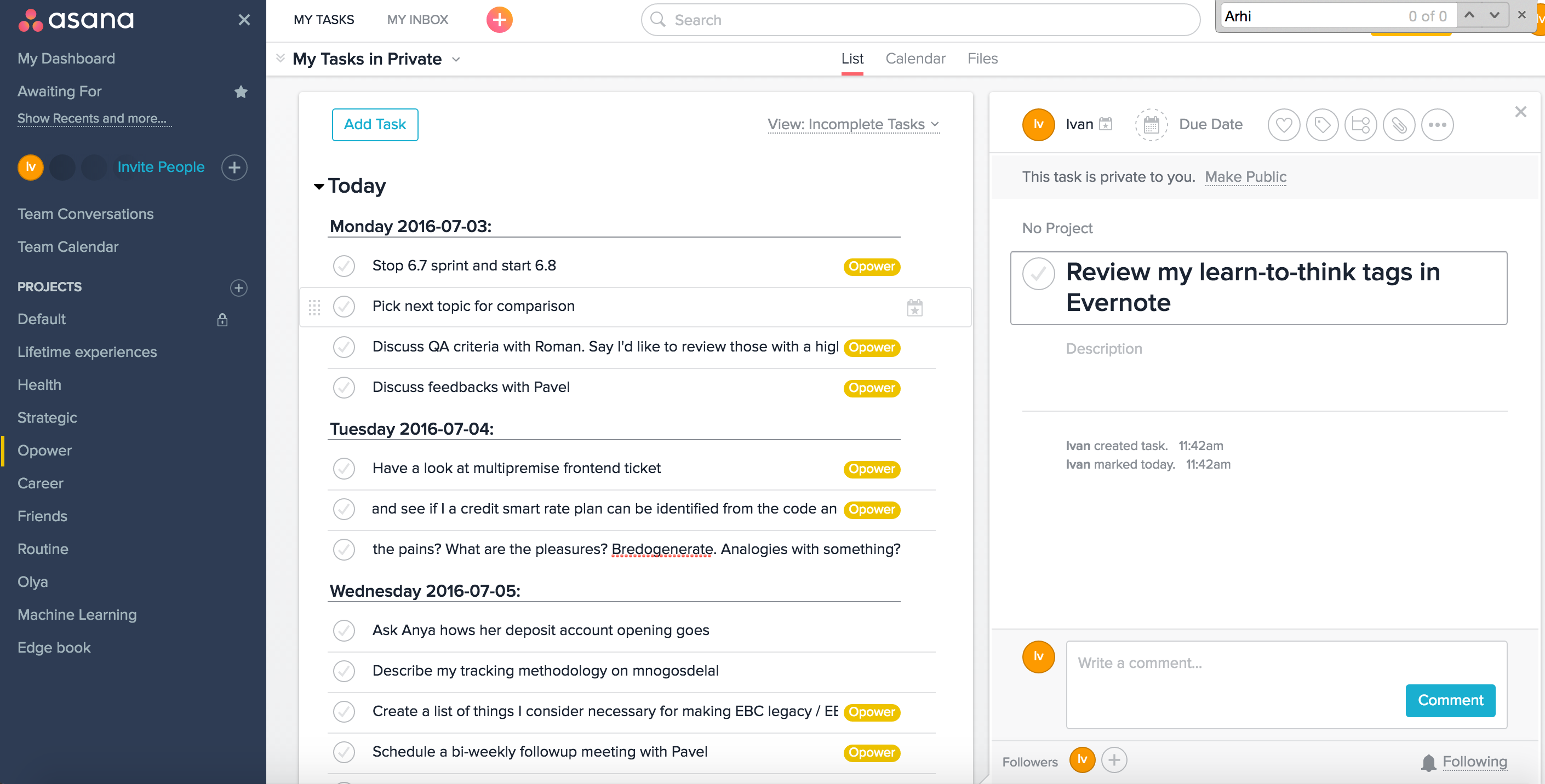 Свой список дел веду в Asana, выглядит все так: * В Асане есть встроенные ящички для today, upcoming, later
