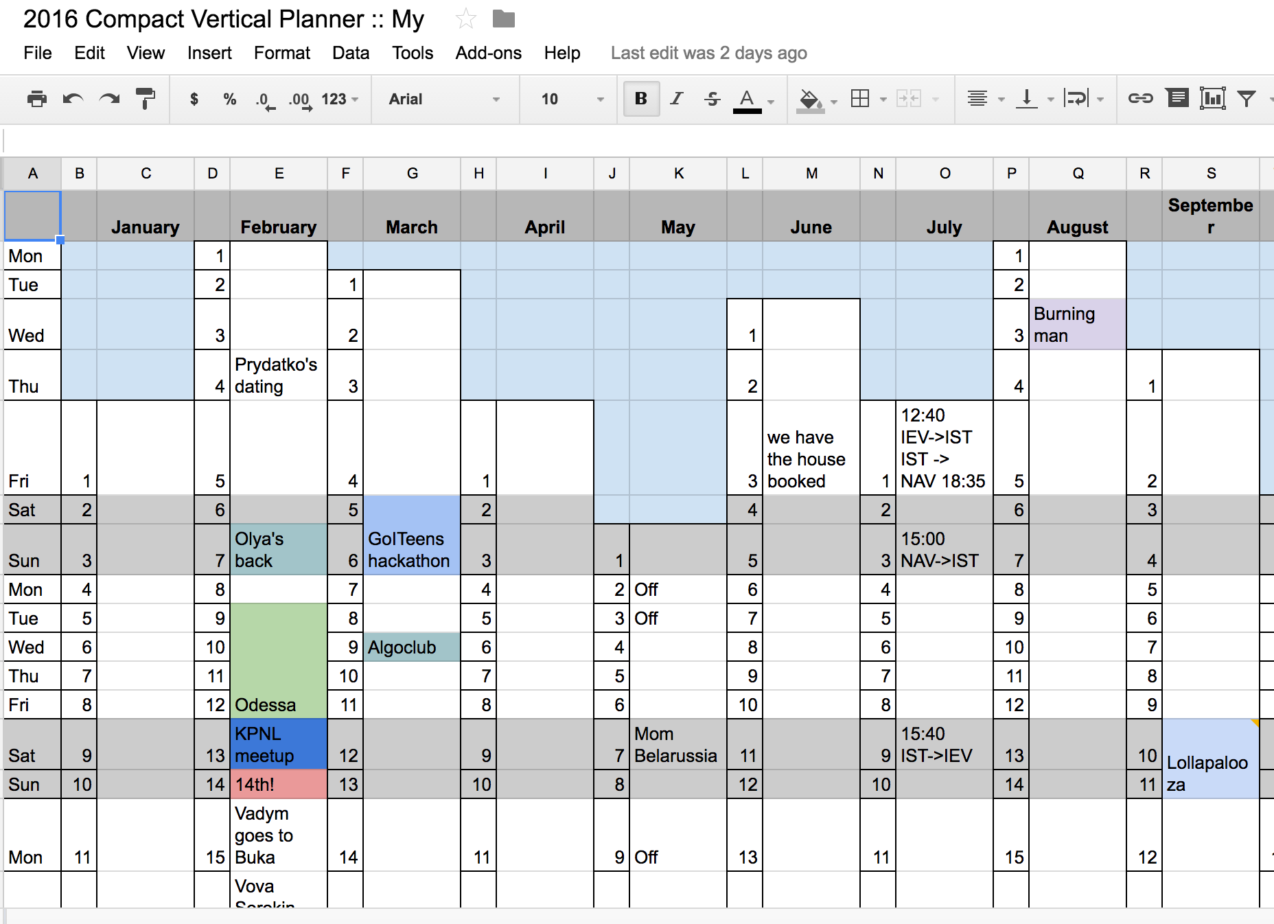 * Гуглокаледарь не сильно мне был удобен для среднесрочного планирования, поэтому мой год живет в Google Spreadsheets, туда я заглядываю прежде чем решить где будет мое тело за пределами двух недель. Вот шаблон для клонирования