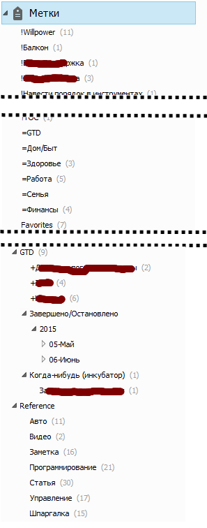 Завершено/Остановлено - когда !проект закончен, у его метки убирается "!". Метка перемещается в эту группирующую метку, а все заметки переезжают в блокнот Завершено.