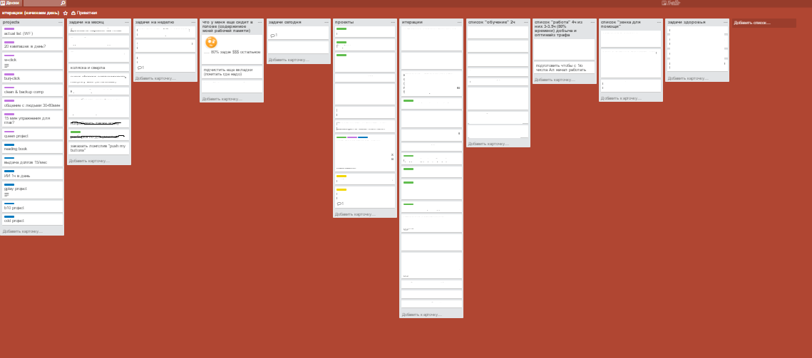 тут по столбикам: projects, задачи на месяц, задачи на день, дальше со смайликом выписывается "все из головы", задачи на сегодня, проекты, итерации, обучение, работа, программирование, здоровье.