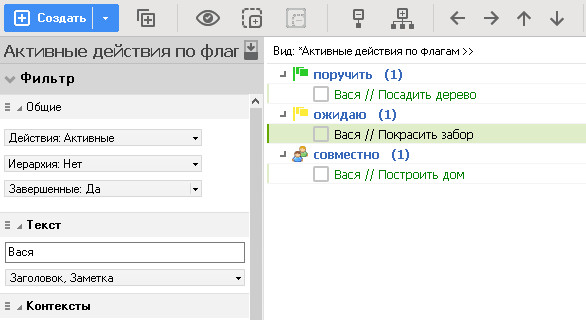 Когда нежданно приходит определенный человек, основная задача инструмента планирования максимально быстро вытянуть из всех папок, проектов все задачи, связанные с Васей.