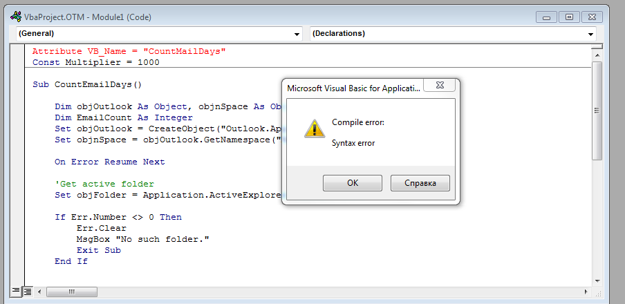 Друзья, сделал макрос в аутлуке и наконец то начал жить без кирпичей на дне пустого инбокса. Но внезапно - через 2 недели примерно, макрос перестал работать.