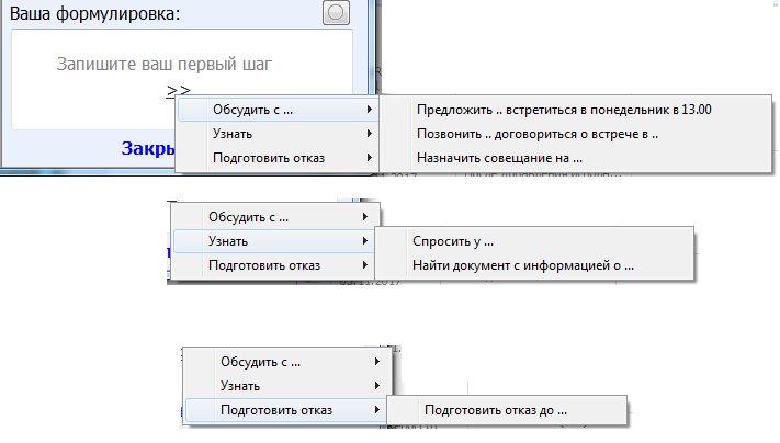 Итак, помимо того, что пользователю упорно "навязывается" правильная методология работы, я решил ему предоставить следующий функционал - ТИПОВЫЕ формулировки.